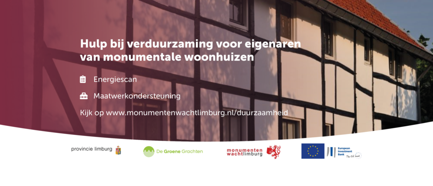 De Provincie Limburg helpt in samenwerking met Monumentenwacht Limburg en De Groene Grachten eigenaren van woonhuis monumenten in Limburg met verduurzamen Zij kunnen nu een gratis Duurzaam Monumenten-advies aanvragen om inzicht te krijgen in de duurzame kansen voor hun woning. Voor wie al een adviestraject doorlopen heeft wordt maatwerkondersteuning geboden.